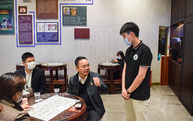 進店后分桌而坐,主動摘下口罩帶頭進行堂食消費,品嘗雙皮奶、姜撞奶等特色美食,以實際行動支持餐飲行業經營發展,鼓勵市民放心消費。還積極詢問商家復工經營情況,并現場協調解決。